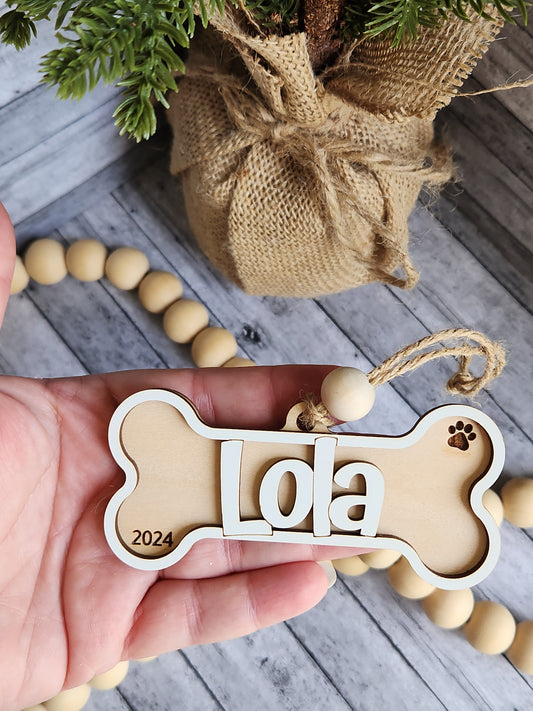 Personalized Dog Bone Christmas Ornament – Custom Pet Name with Year • Wooden Pet Keepsake • Dog Christmas Tree Decoration