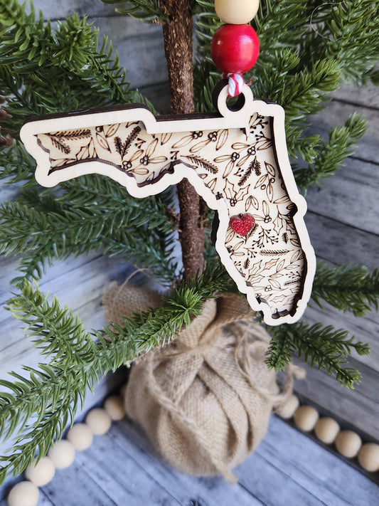 Personalized State Christmas Ornament – Any State with Custom Heart Location • Laser Engraved Wood Holiday Keepsake Gift