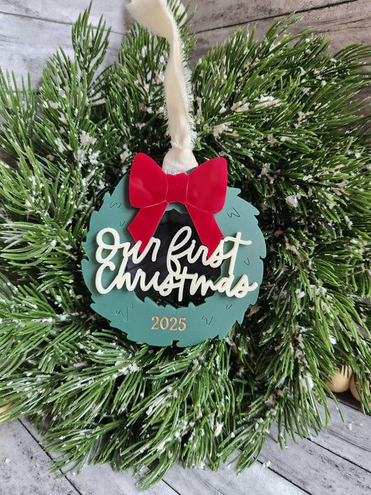 Our First Christmas Ornament 2025 – Personalized Wreath with Red Bow | Acrylic Couples Keepsake